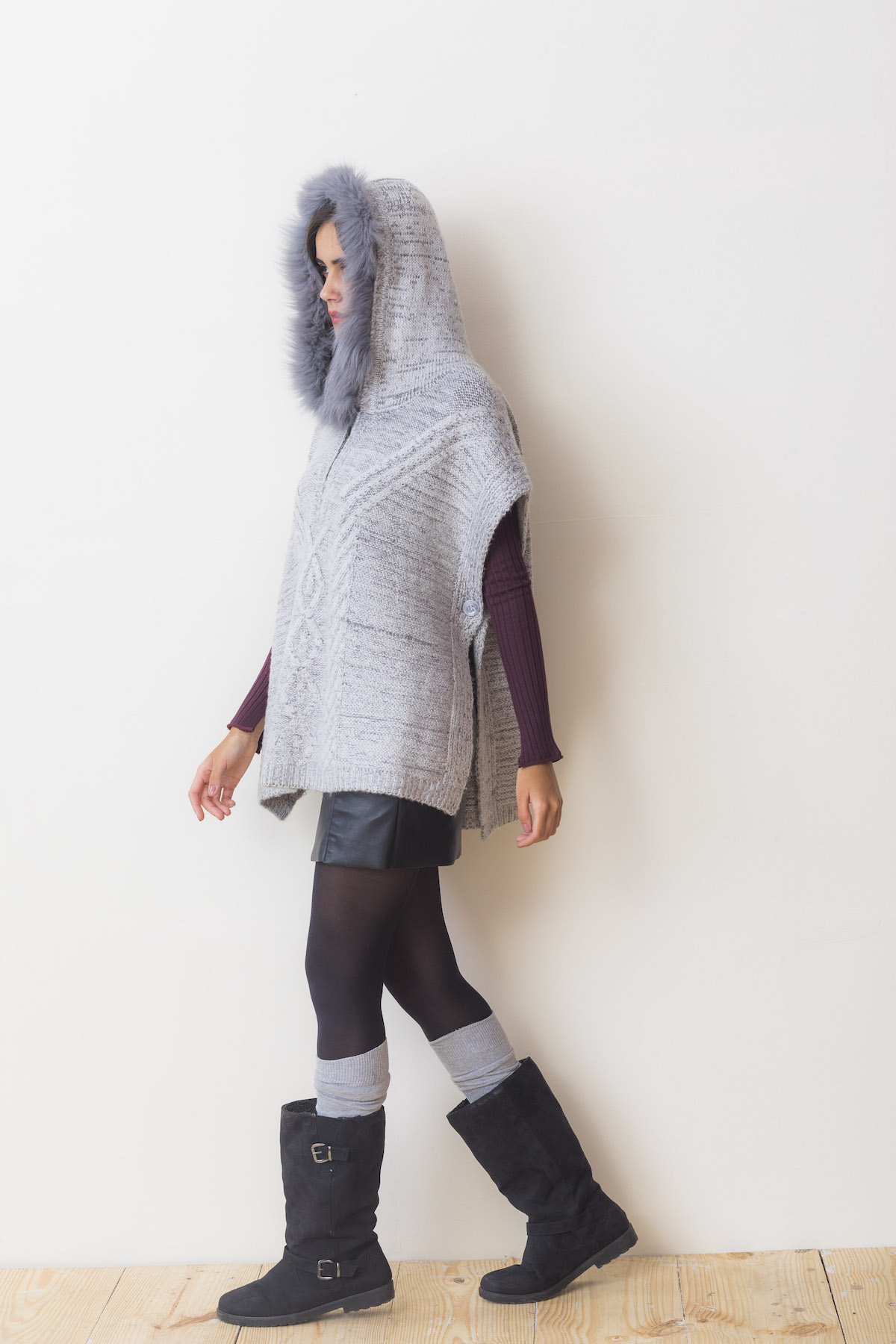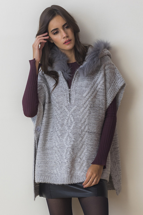MD-1536 - Trend driven poncho style sweater with fur trim hoodie, flattering for anyone.