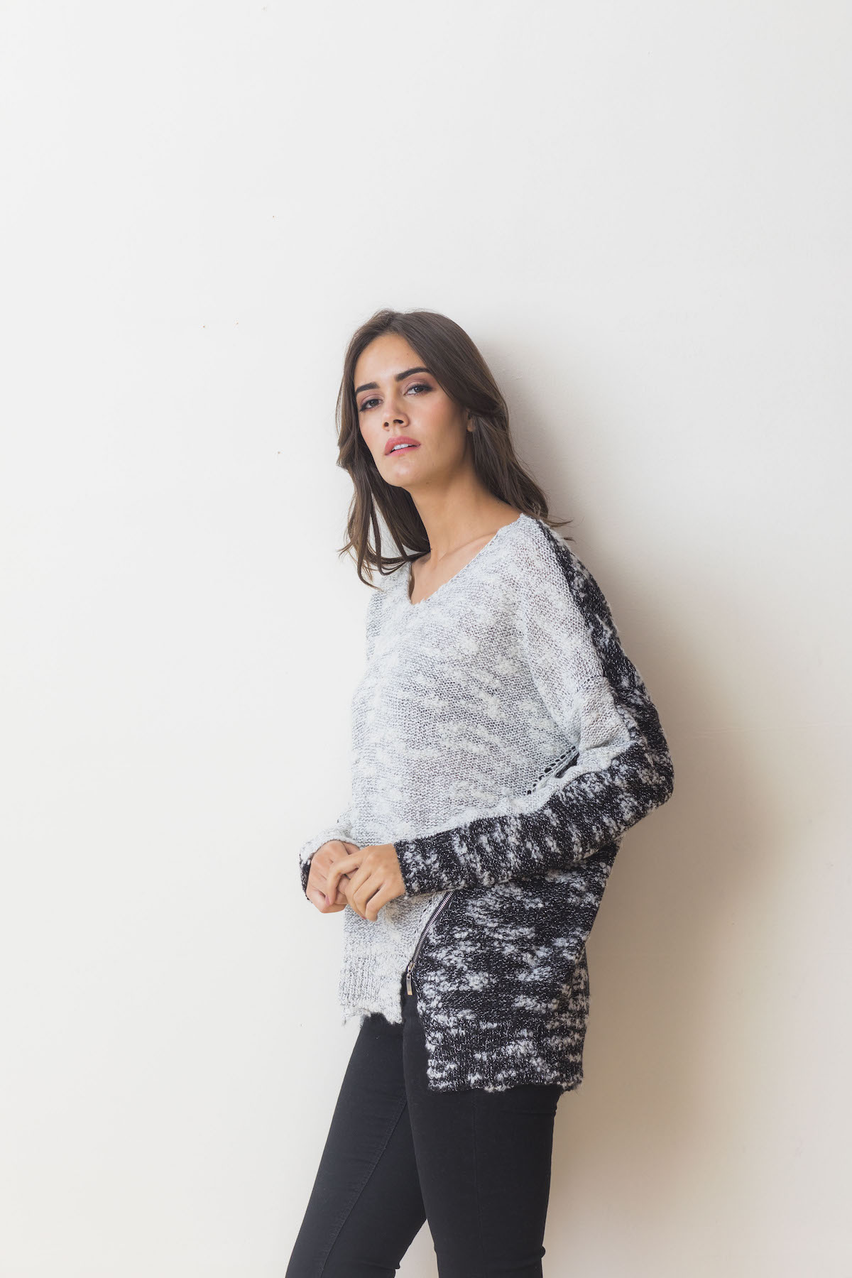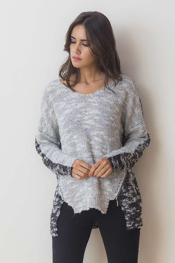 MD-1506 - On trend 2 tone knit block sllub sweater with asymmetrical design and side zip.